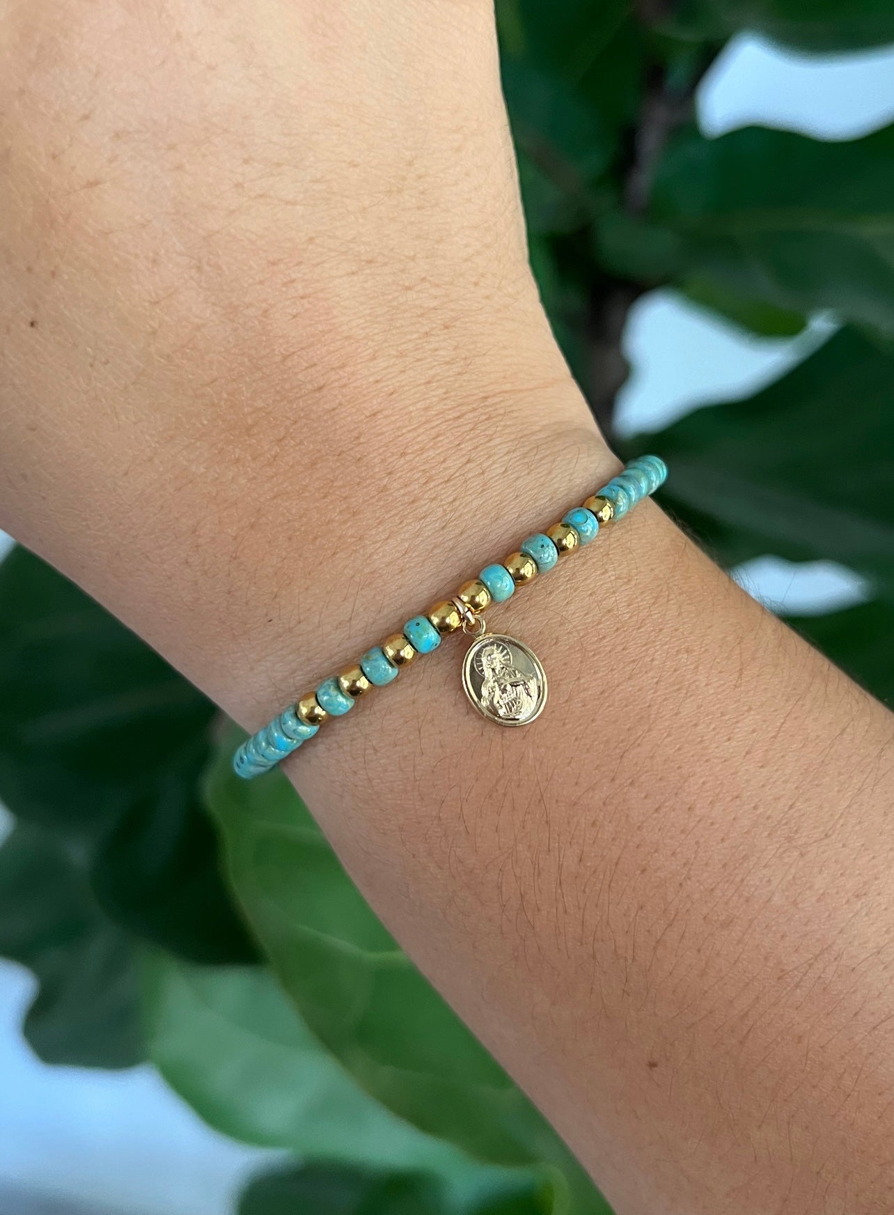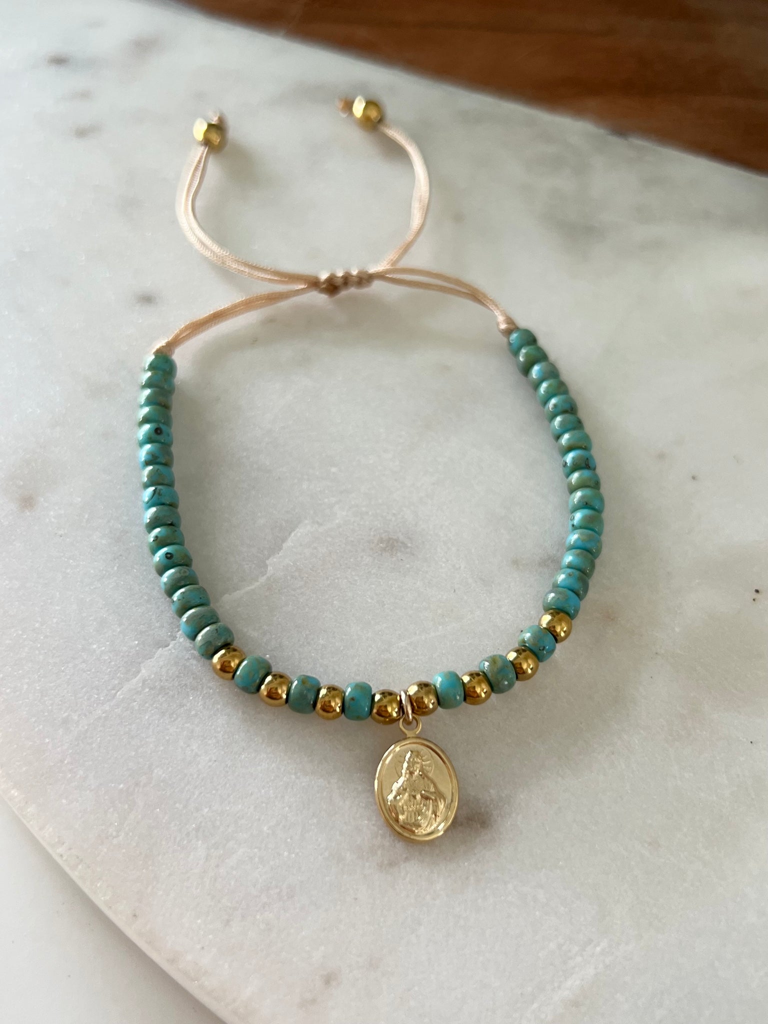 Pulsera ajustable, hecha a mano. Seed beads y balines dorados en acero inoxidable. Medallita de La Virgen María en goldfilled.