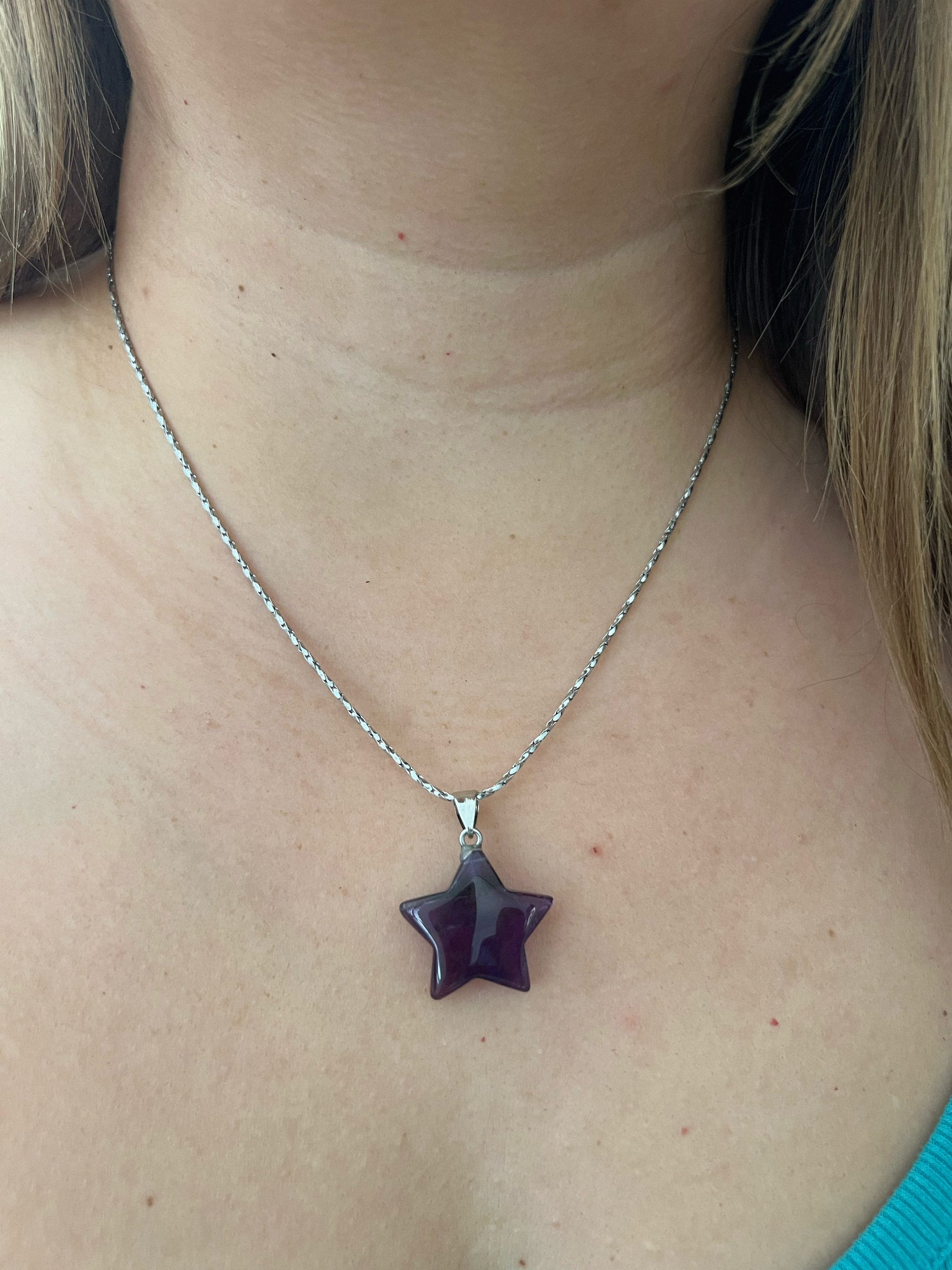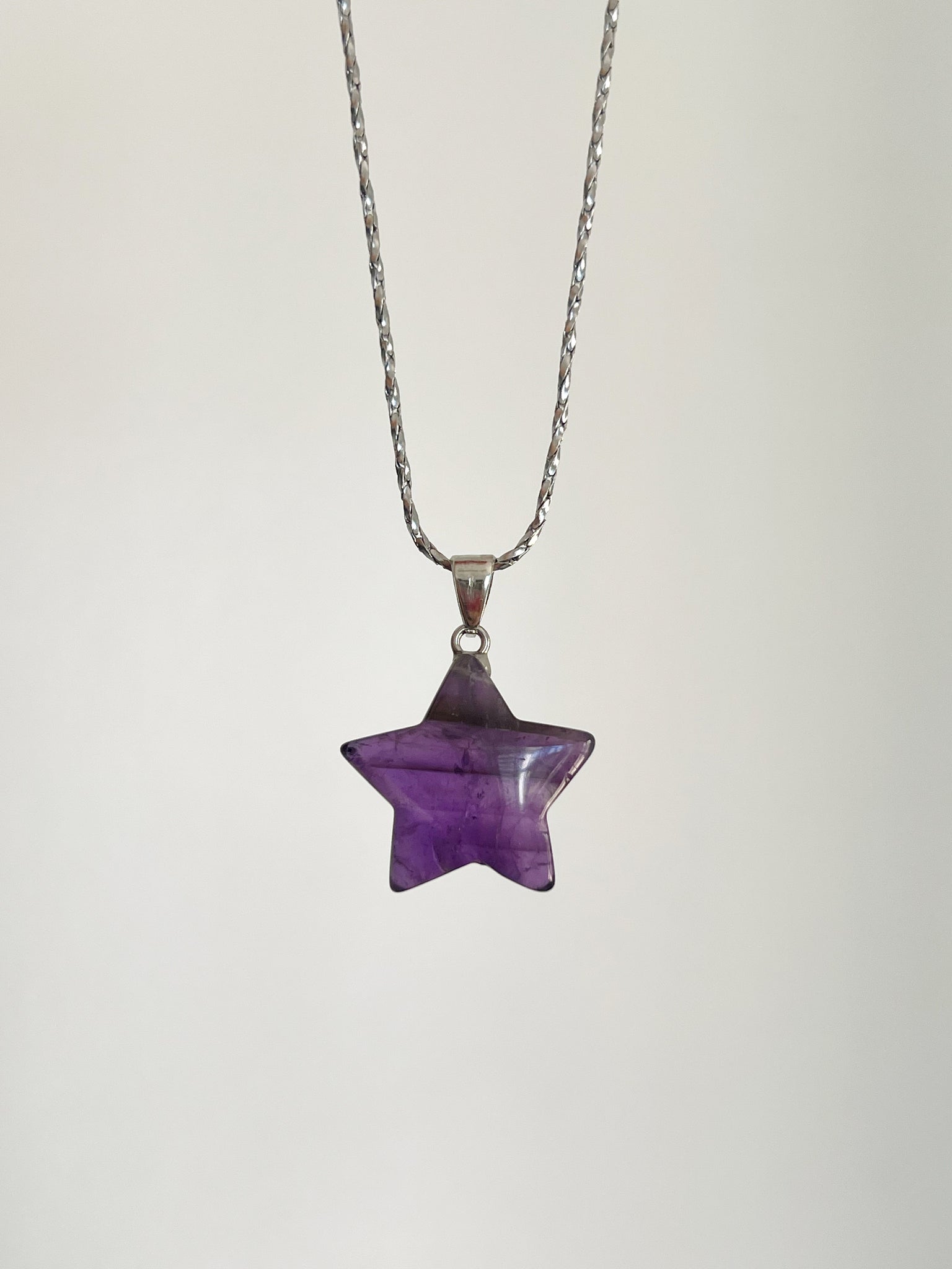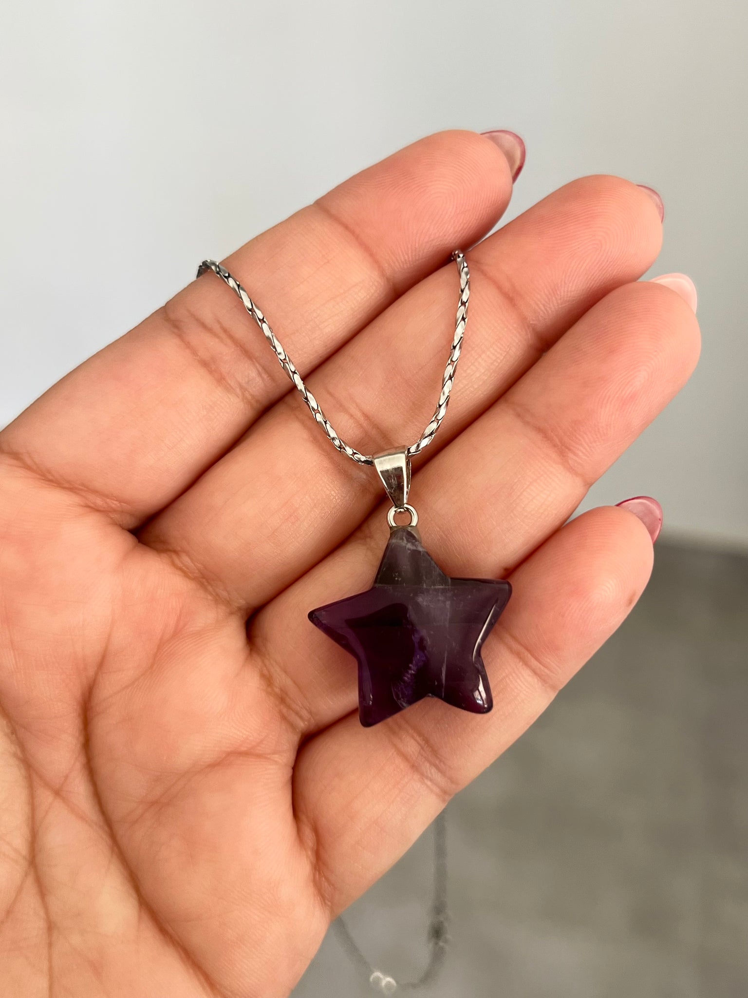 Cadena en acero inoxidable y pendant en forma de estrella de piedra amatista. Mide 20”.