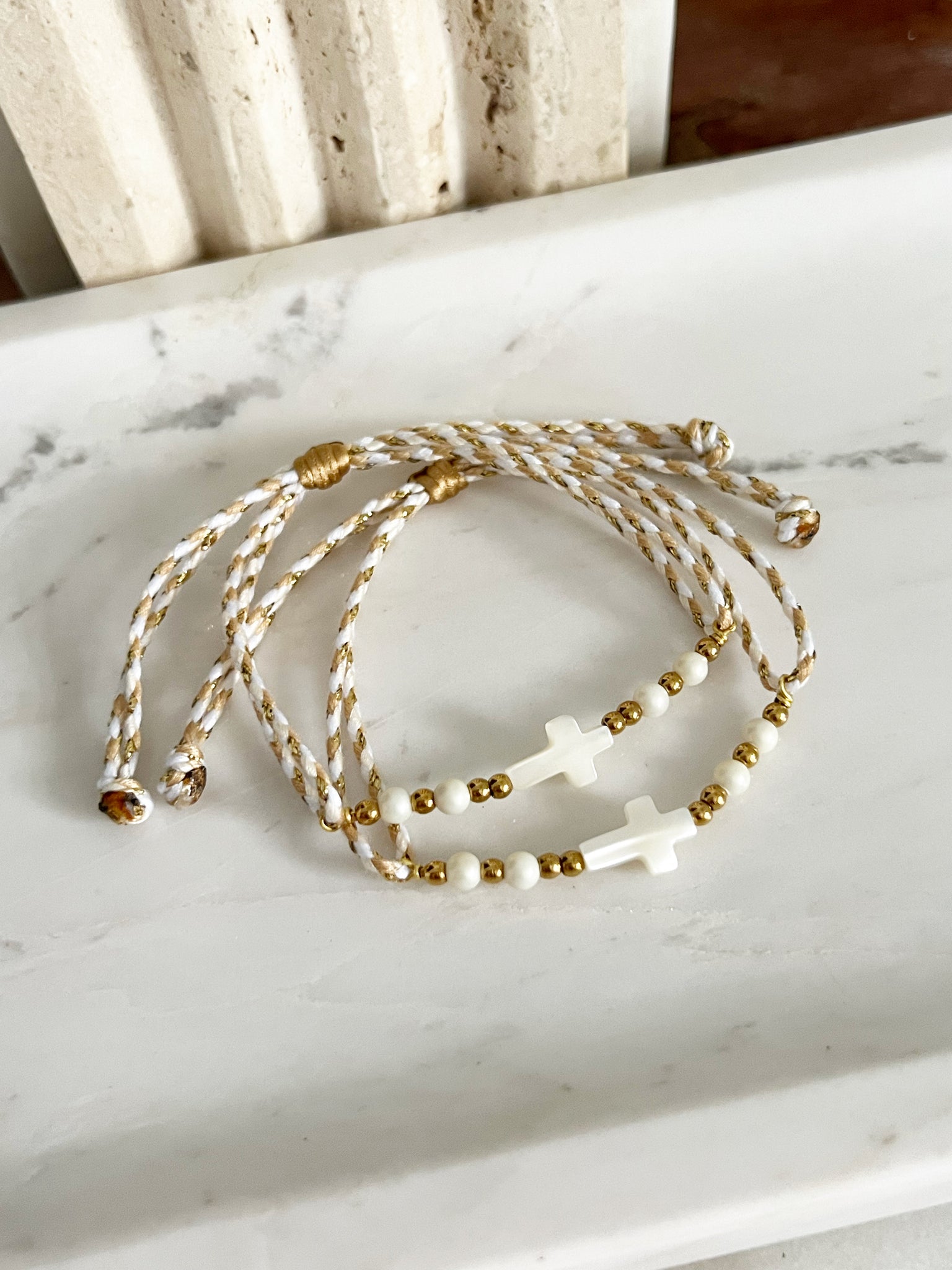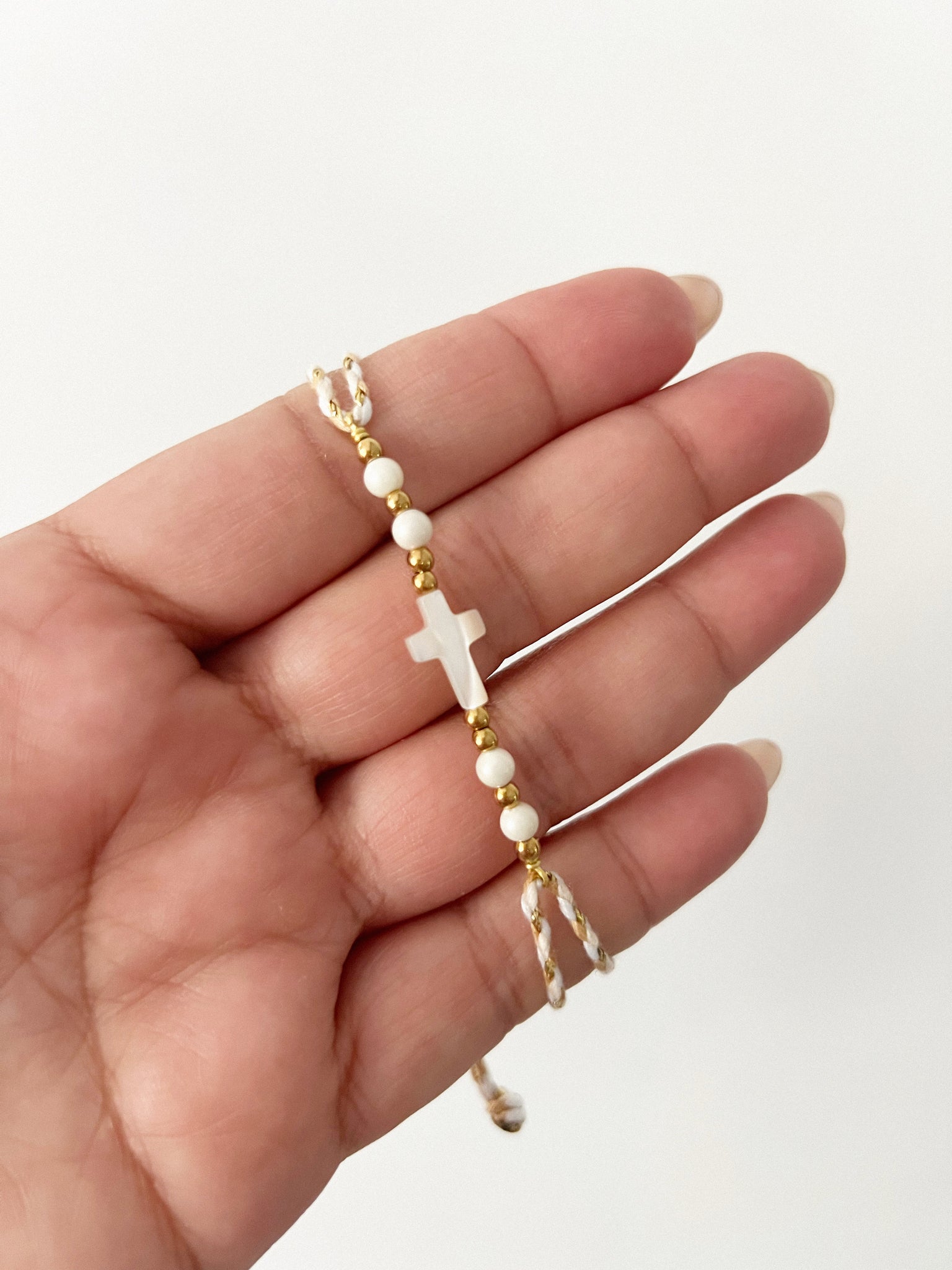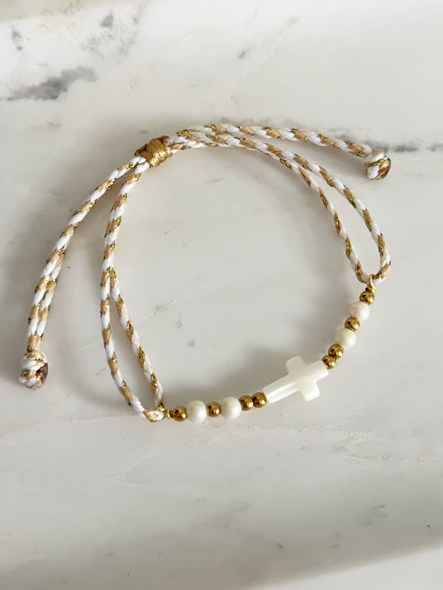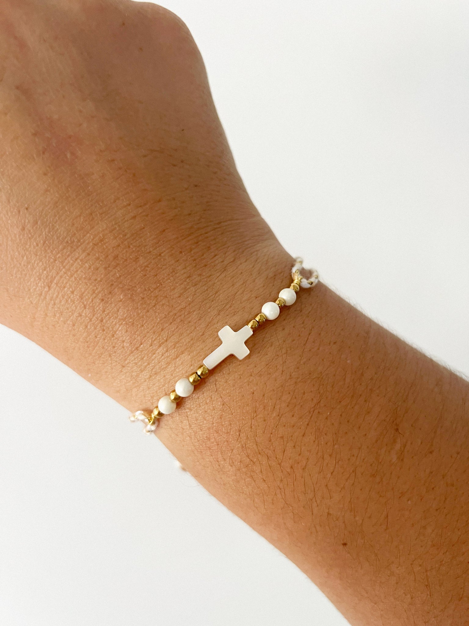 Pulsera hecha a mano. Beads dorados en acero inoxidable, perlas naturales y cruz en nácar. Es ajustable.