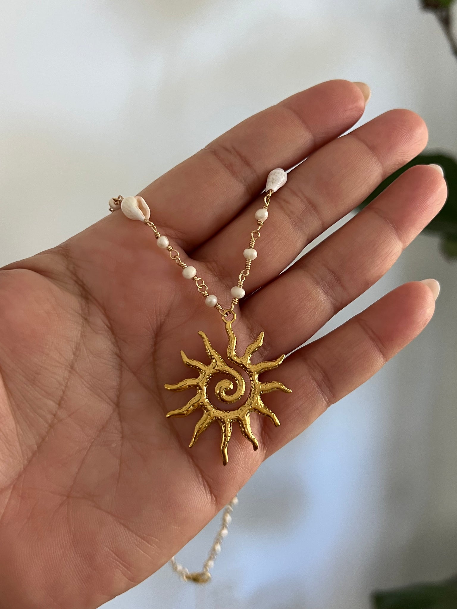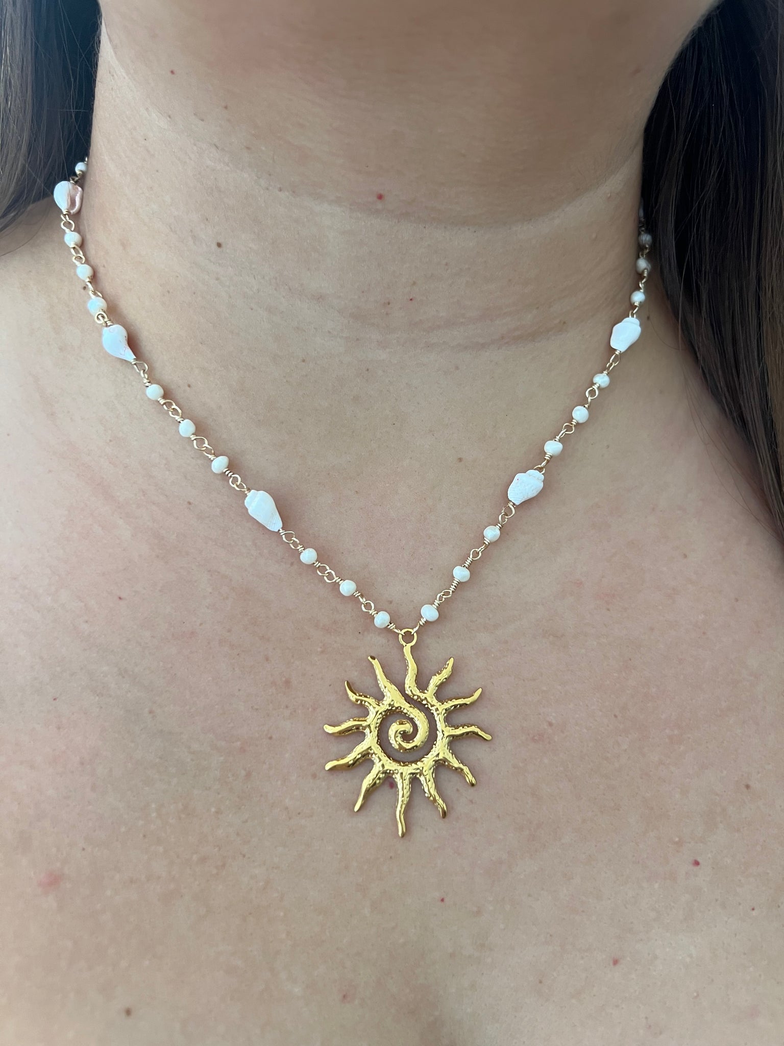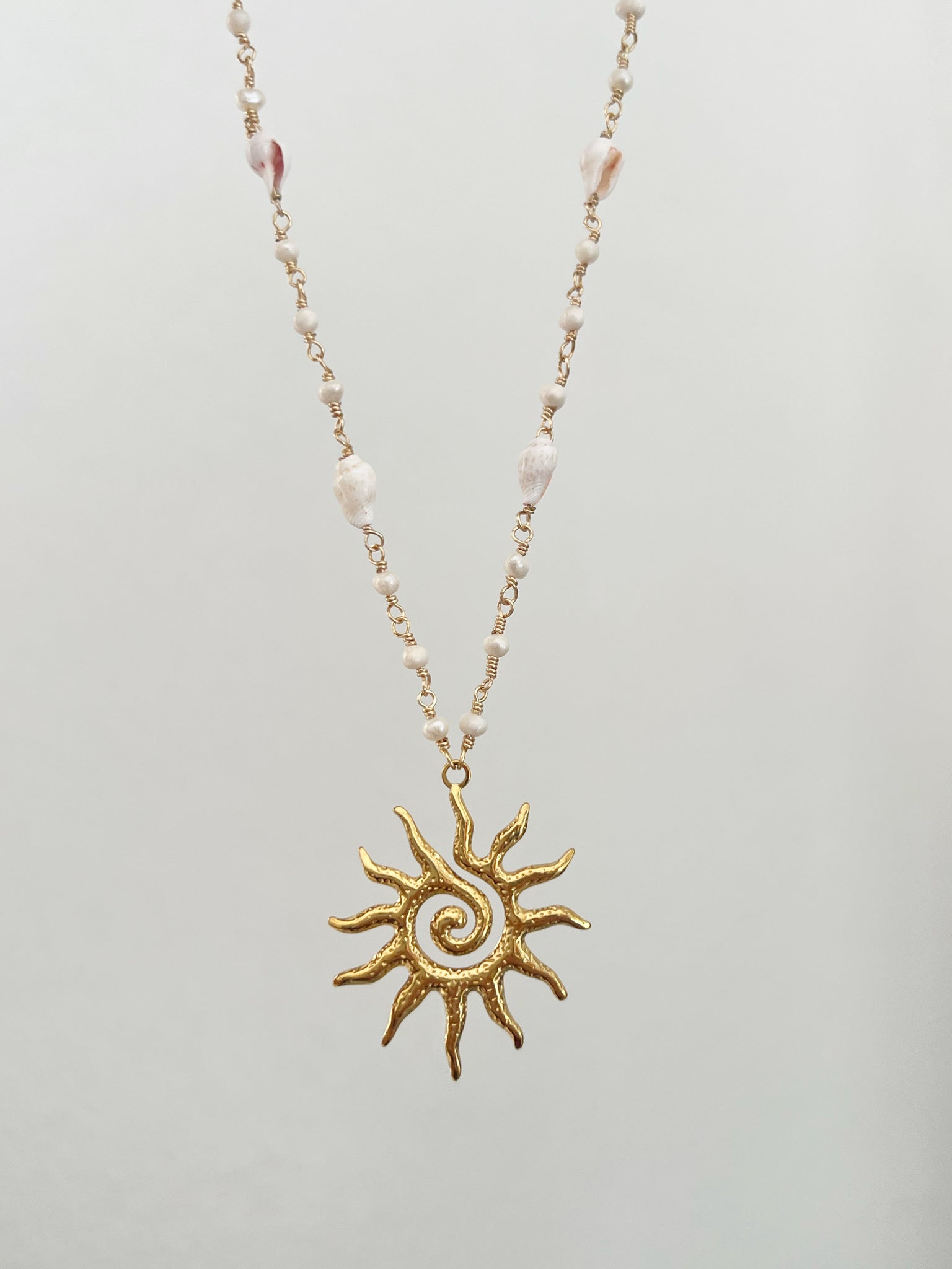 Cadena alambrada a mano con perlas de agua dulce, caracoles y pendant de sol en acero inoxidable. Mide 18”.