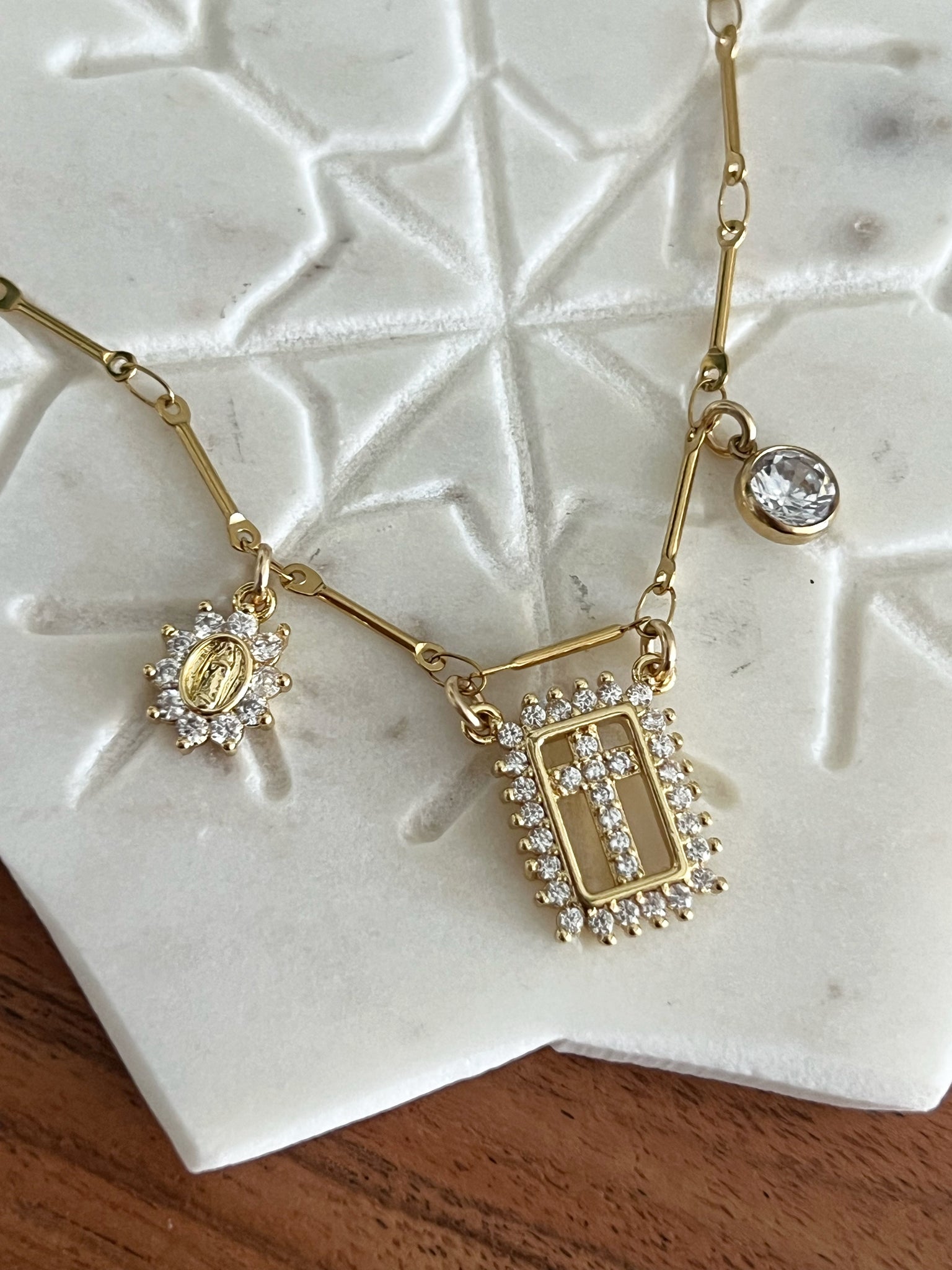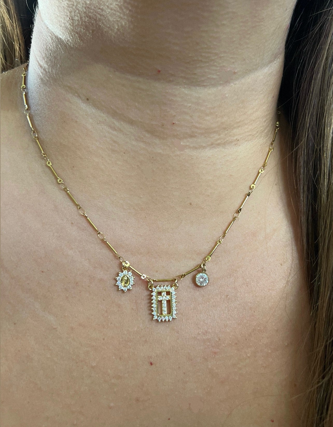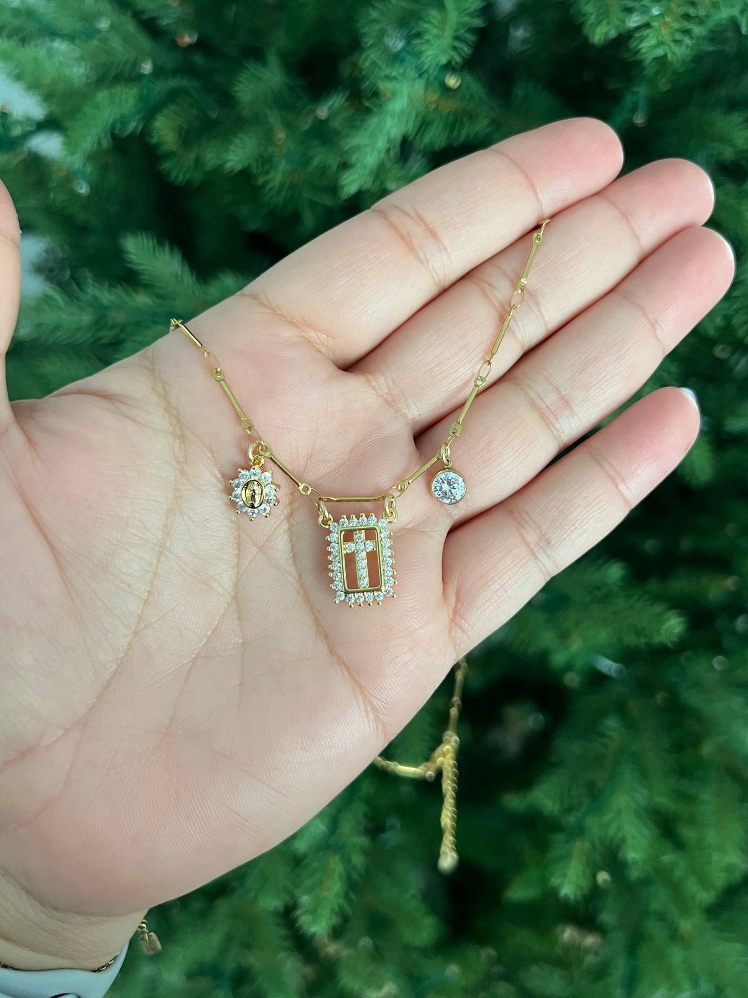 Cadena en acero inoxidable. Mide 17.5” y tiene extensión. Charms en gold plated y gold filled.