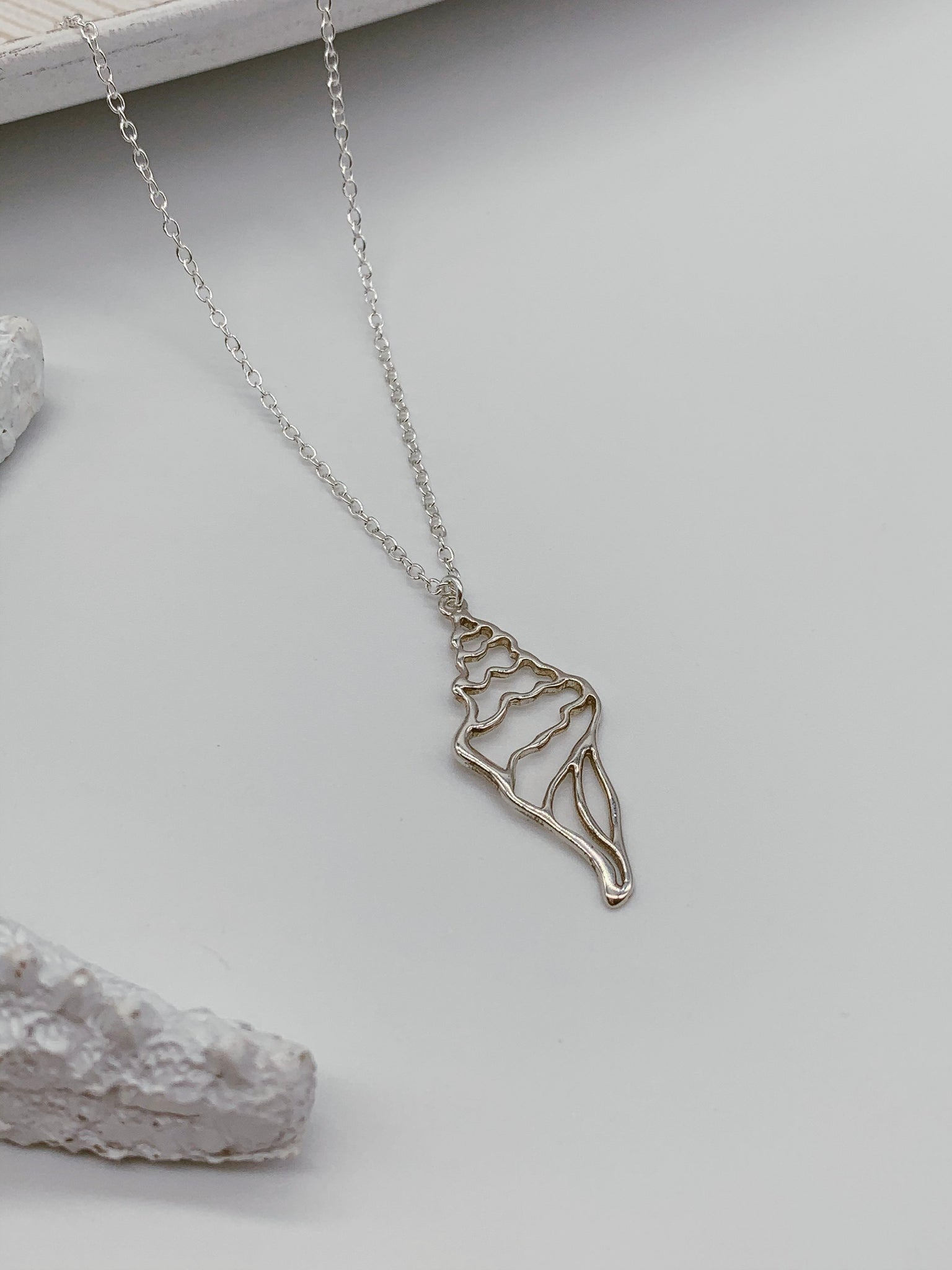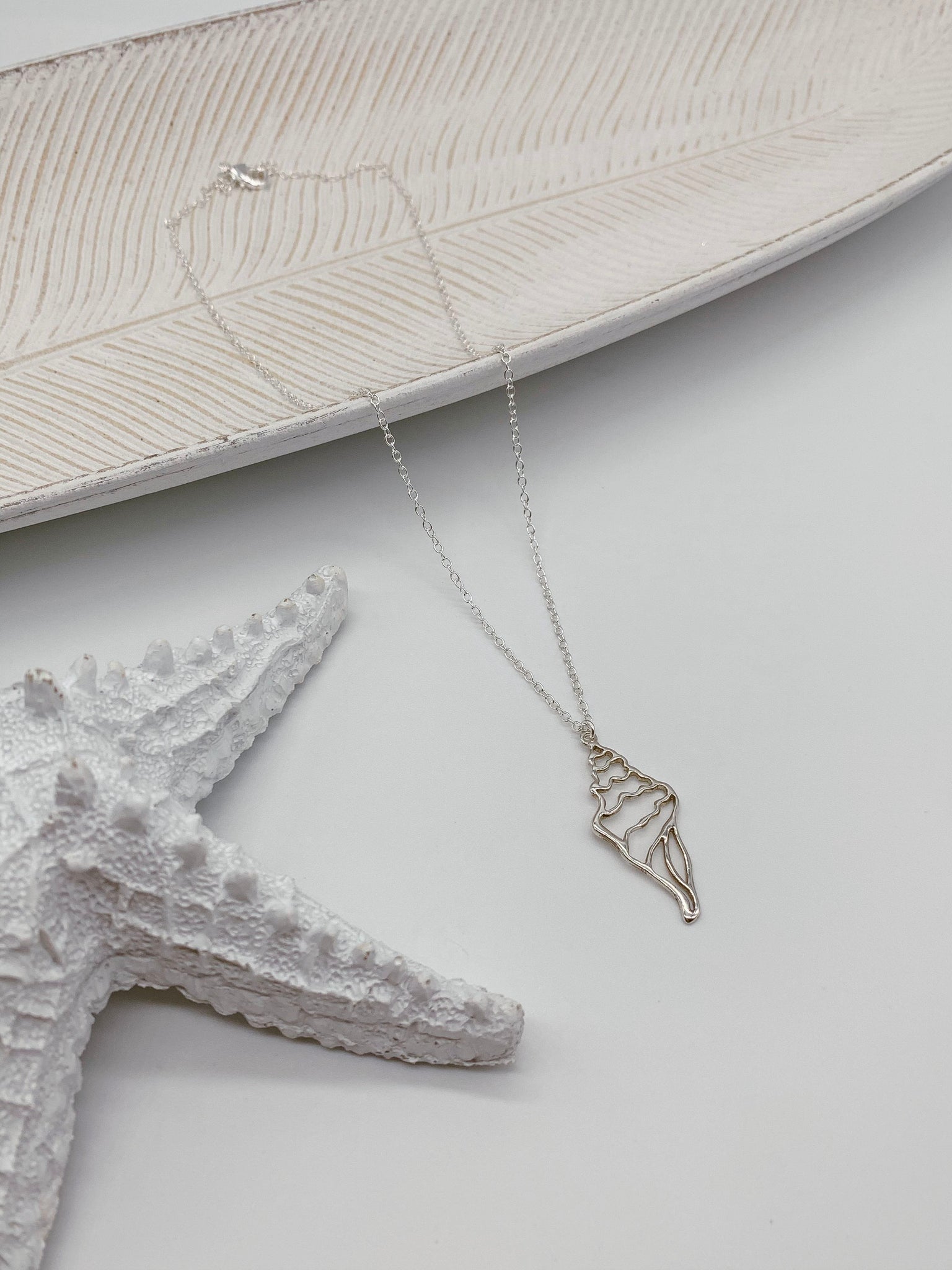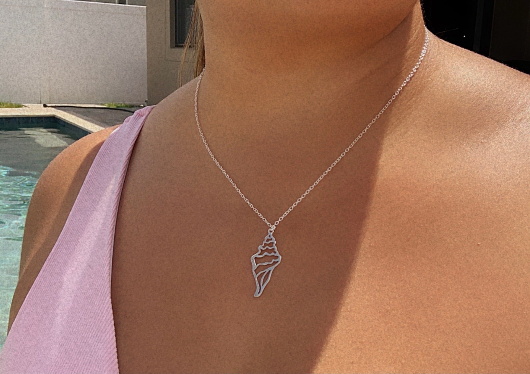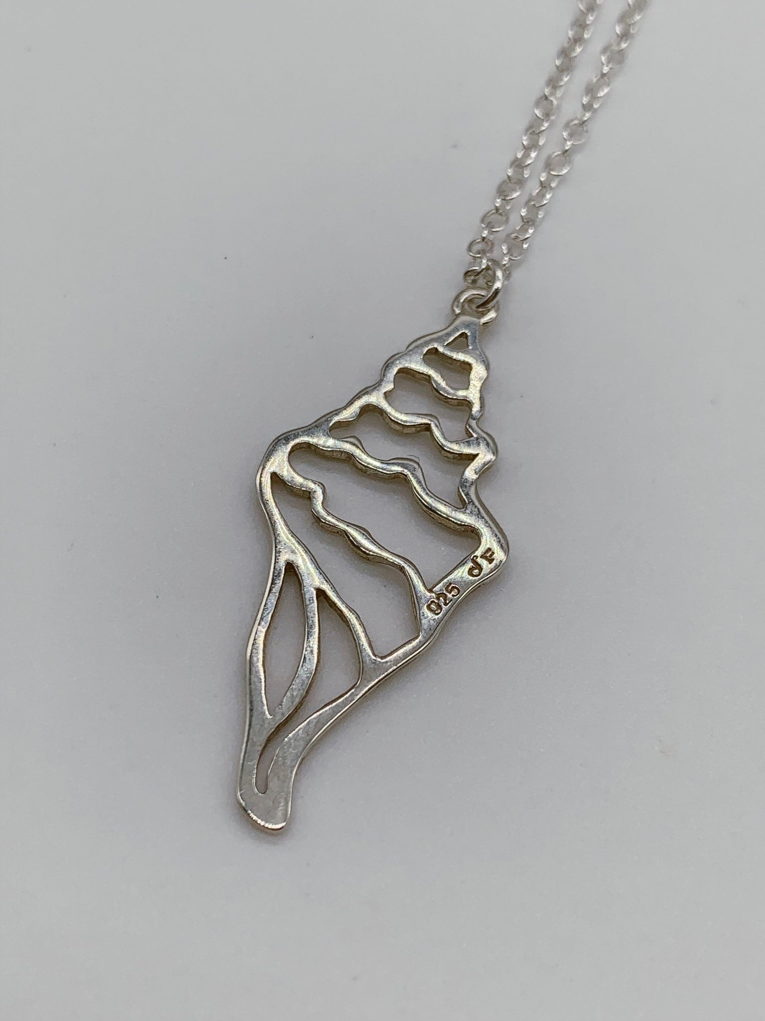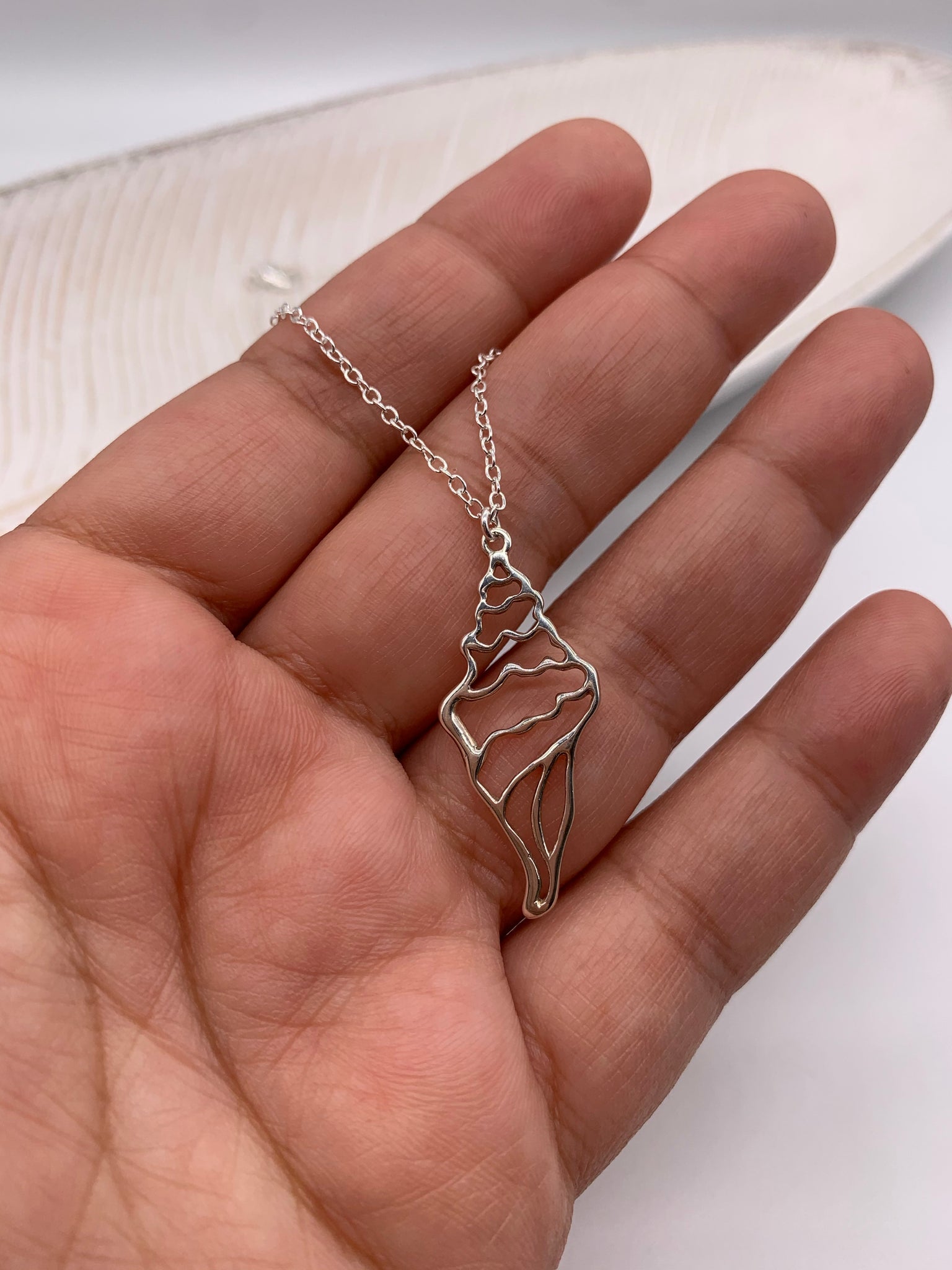 Cadena en acero inoxidable y charm de caracol en plata .925. Mide 18”.