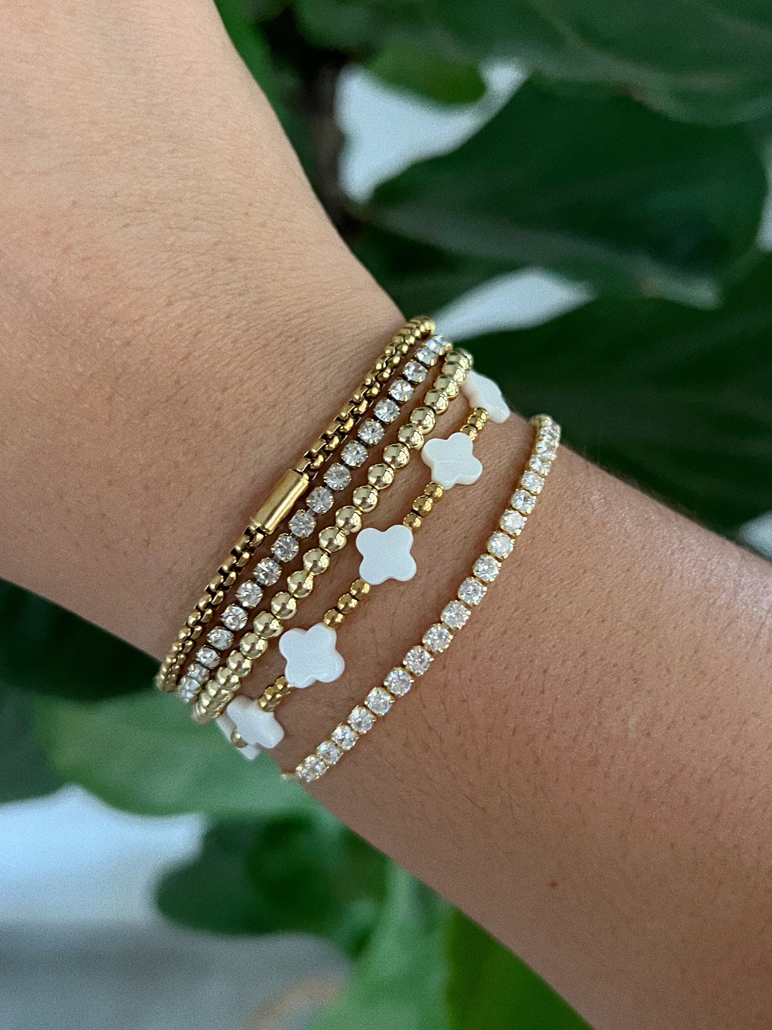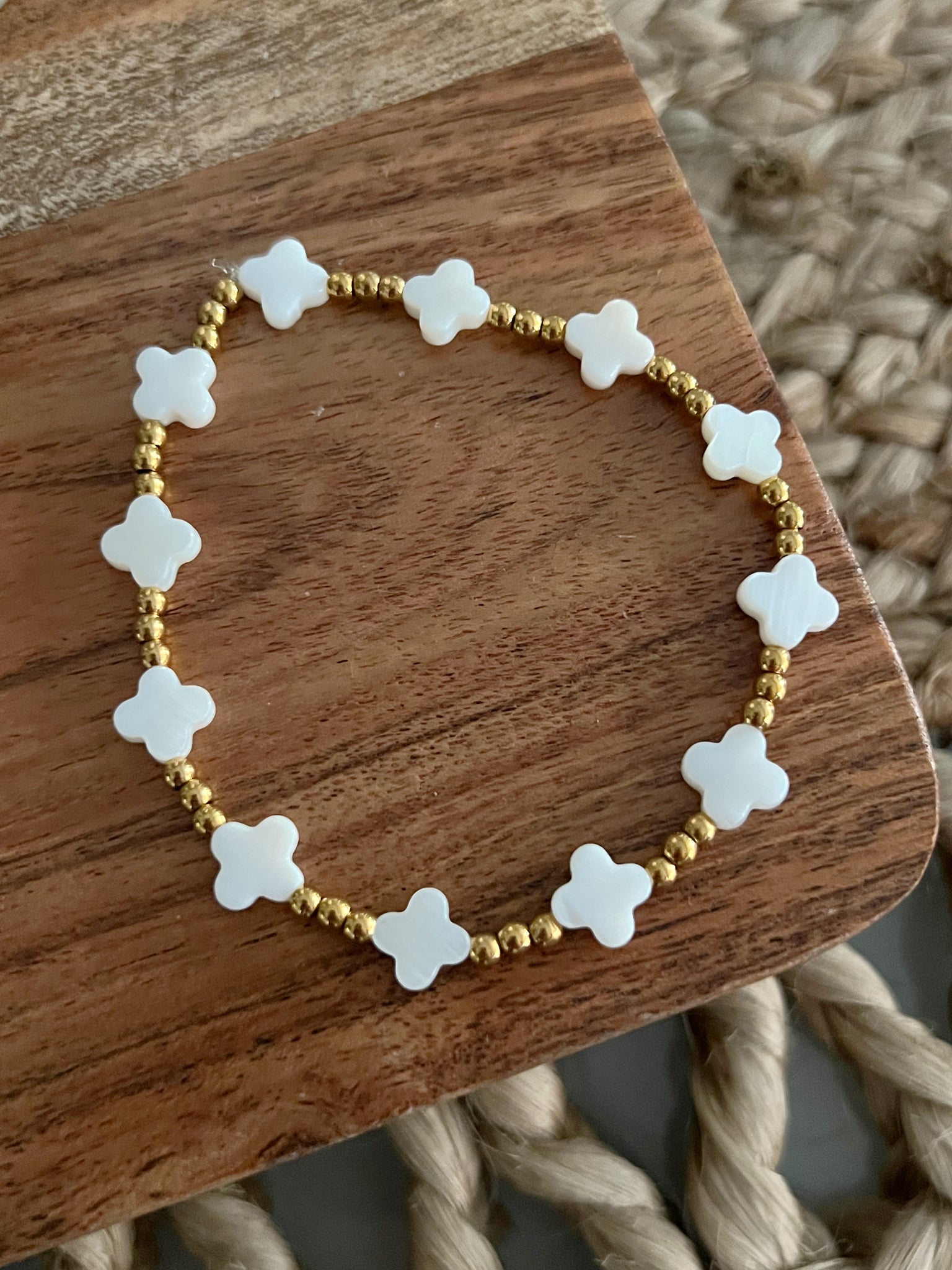 Pulsera elástica con clovers en nácar y beads dorados en acero inoxidable. Mide 7.5 pulgadas.