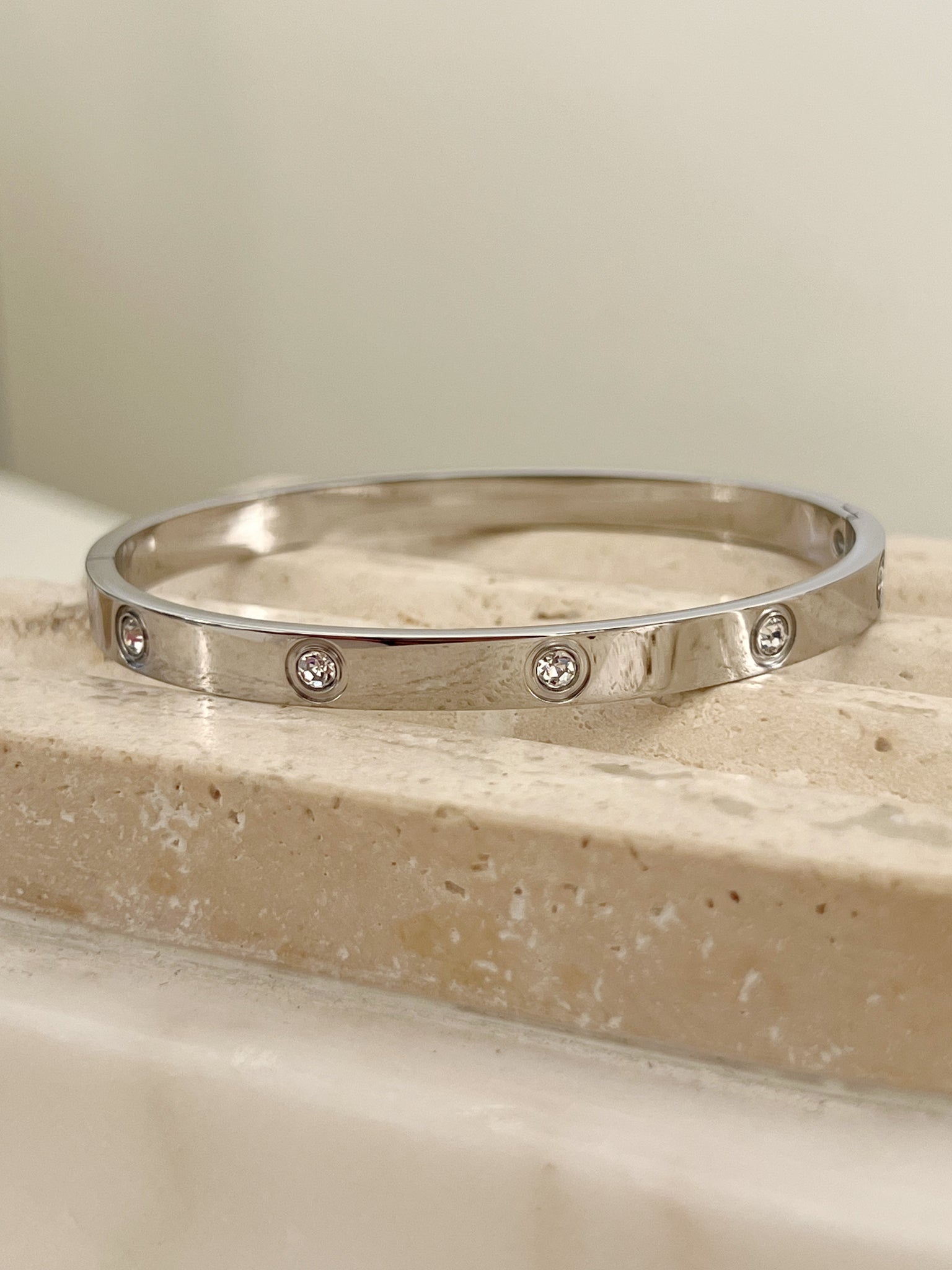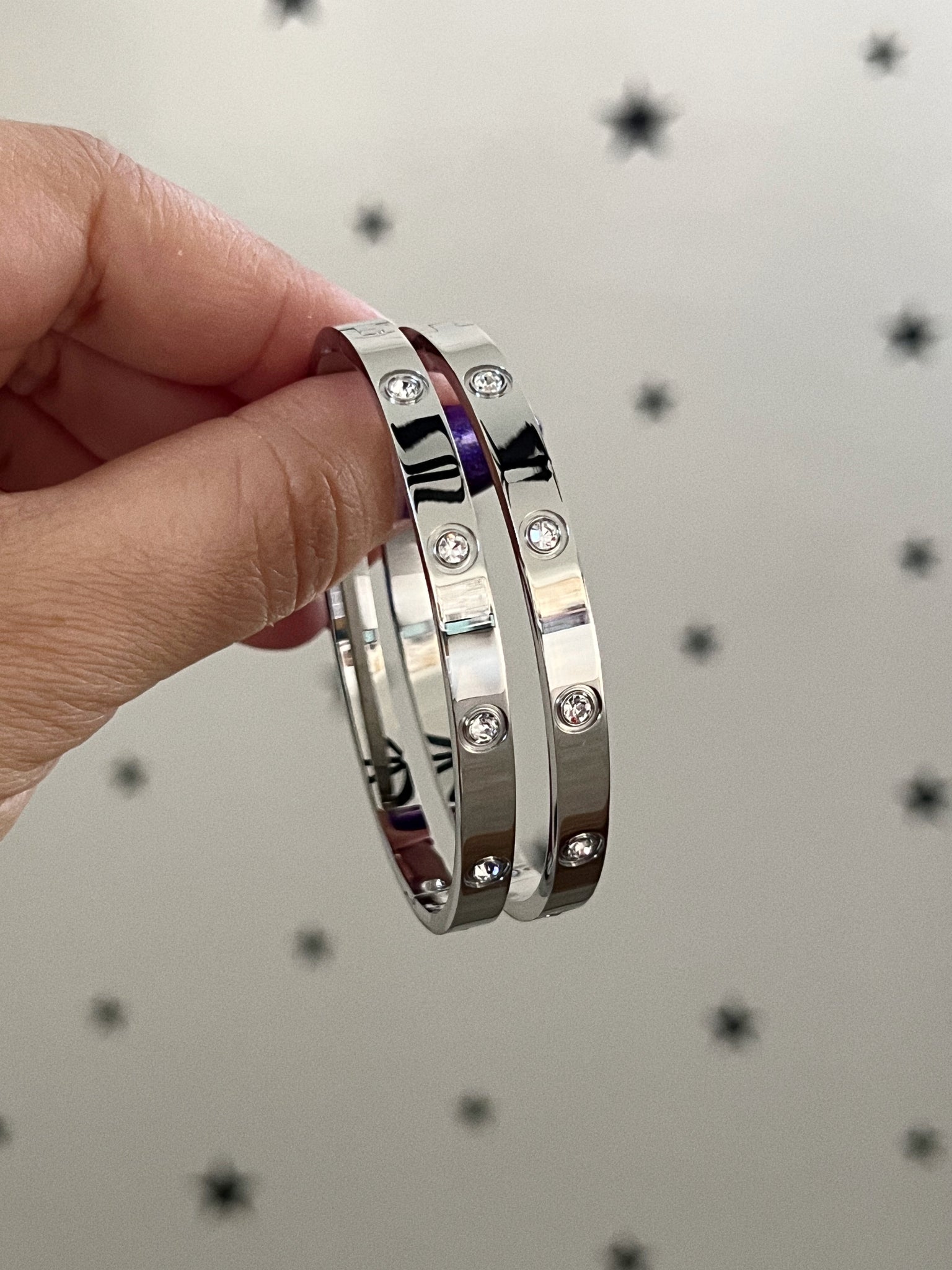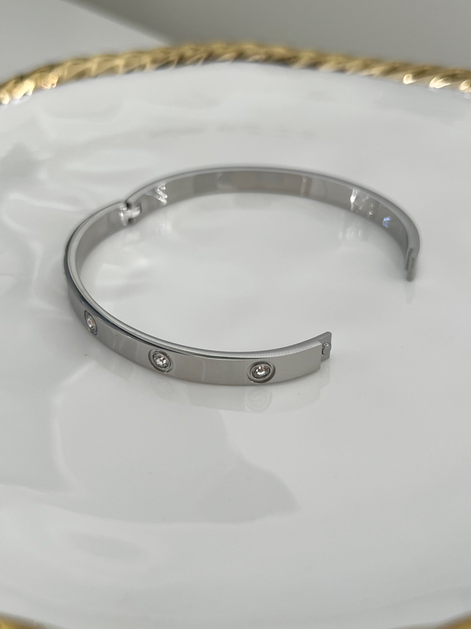Pulsera estilo “bangle” con zirconias. Acero inoxidable. Para muñecas que midan 7.5” o menos.