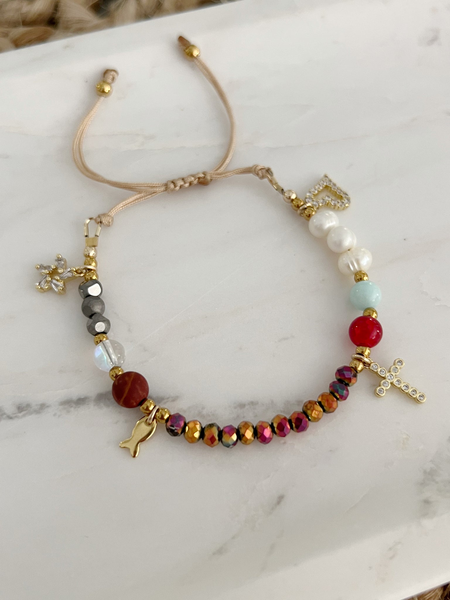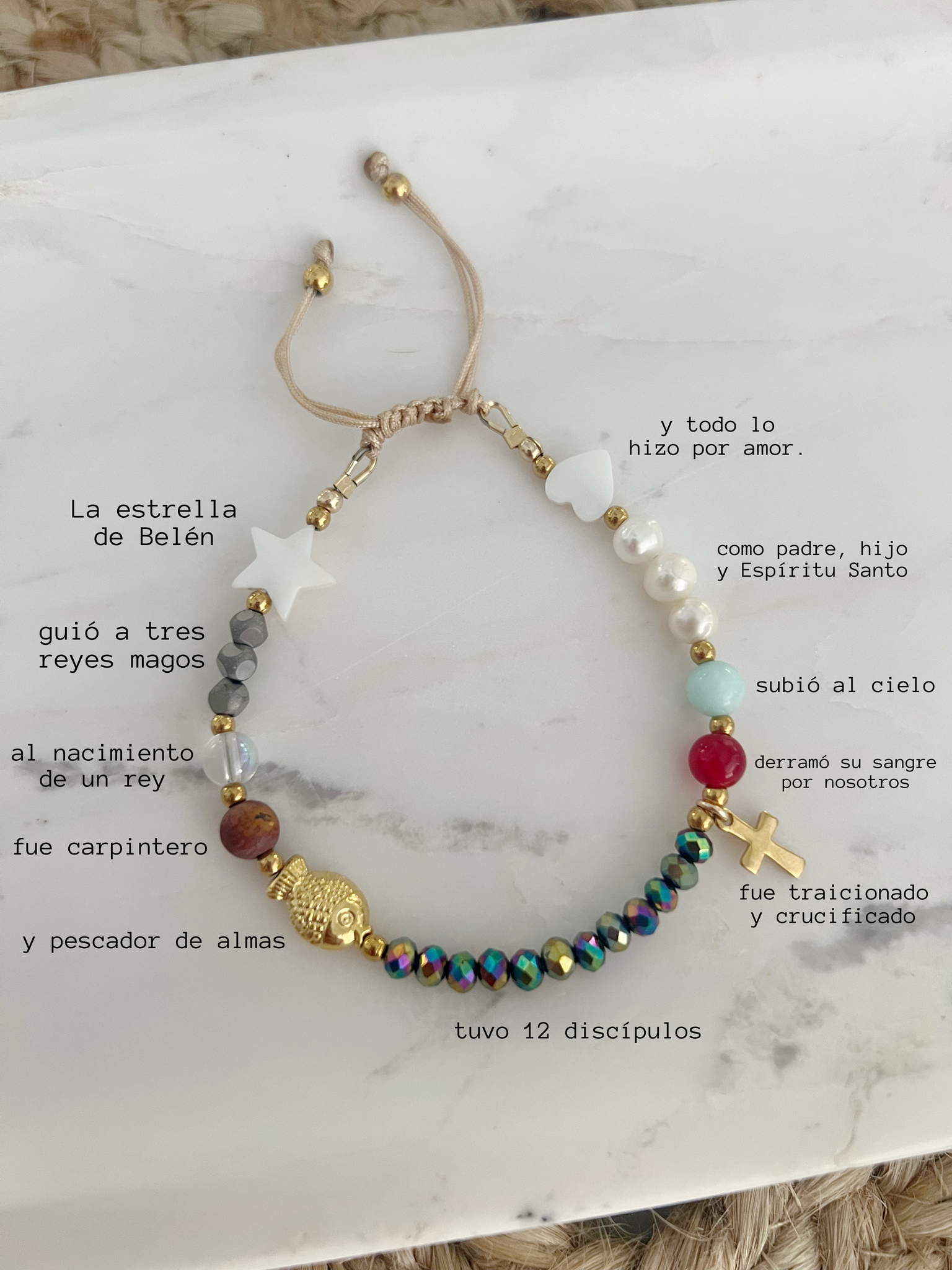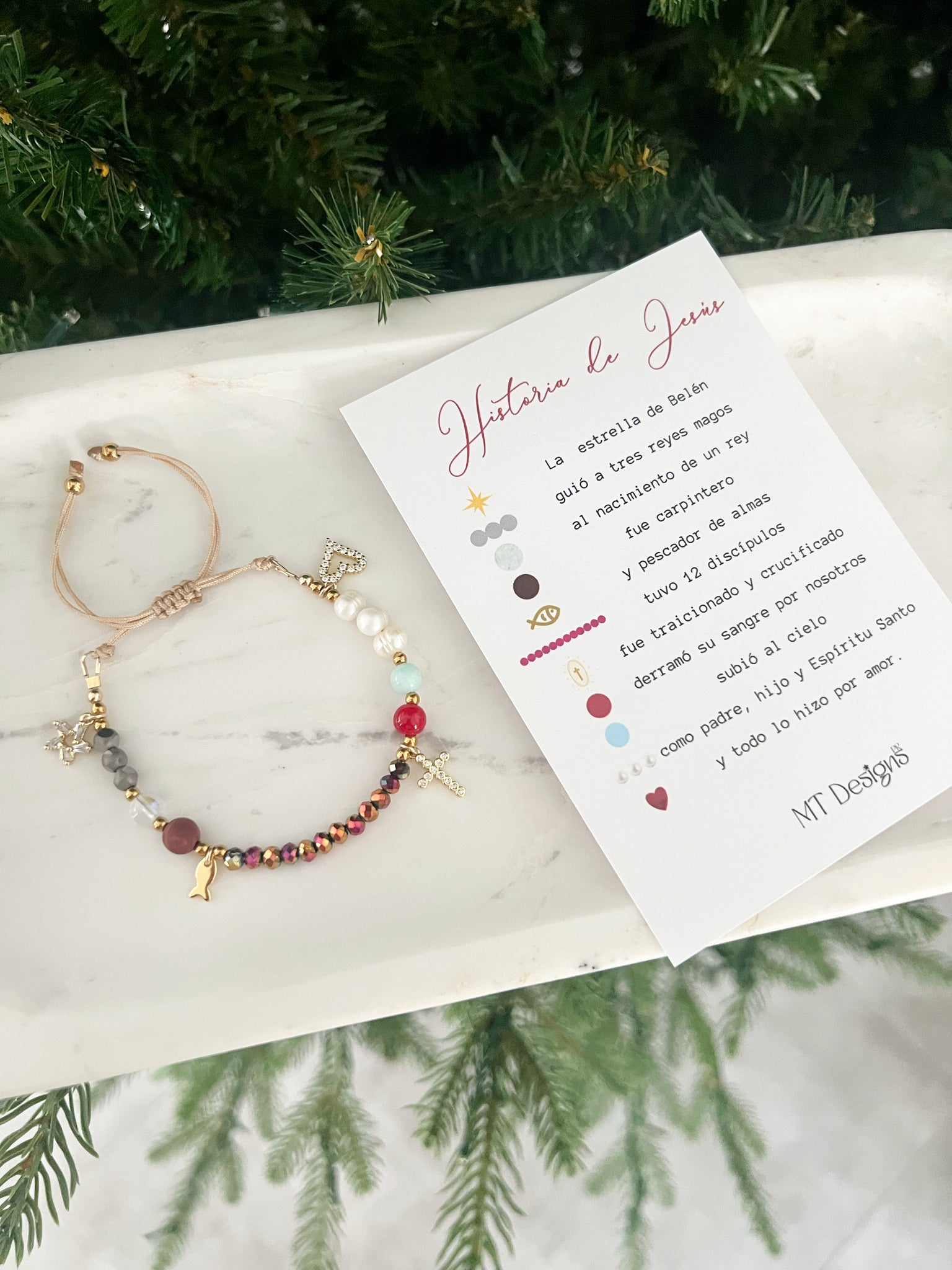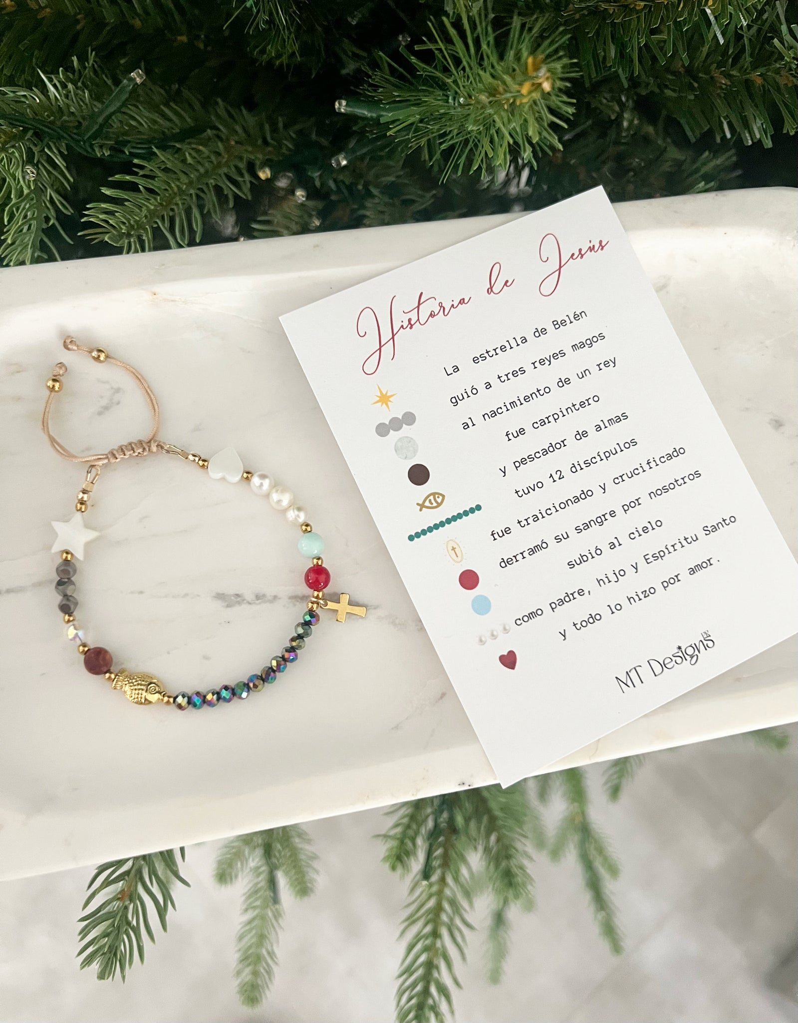 Pulseras ajustables, hechas a mano. Detalles y piezas doradas en gold filled, gold plated y stainless steel. Cada una de las pulseras incluye la tarjeta donde se cuenta la Historia de Jesús