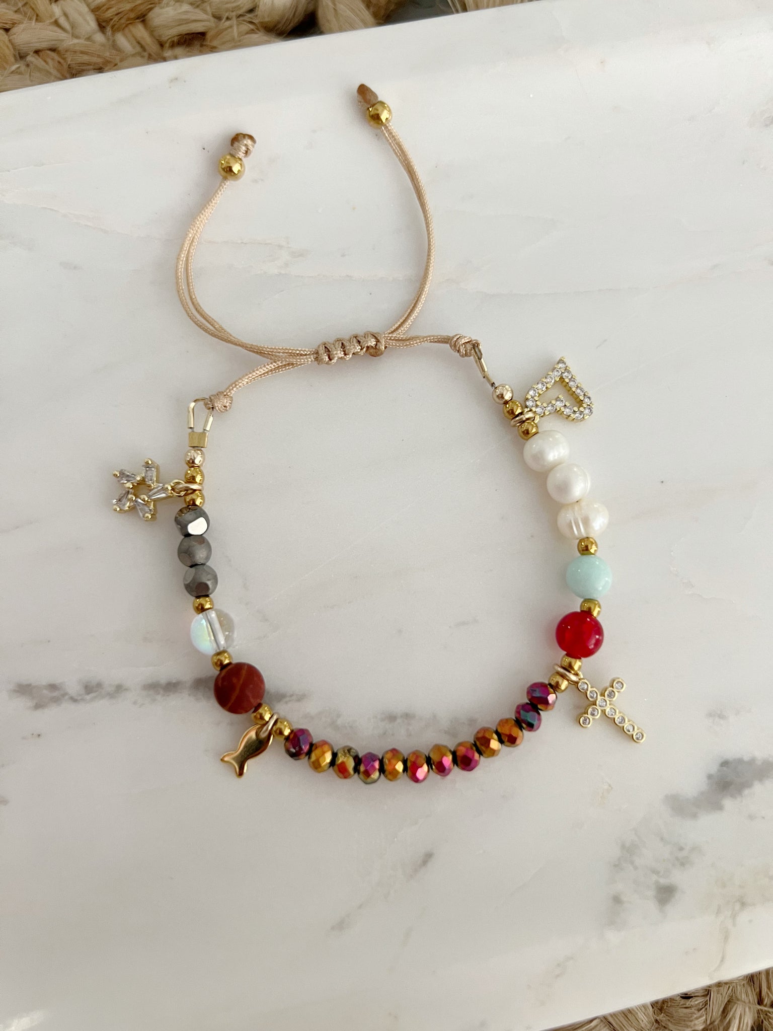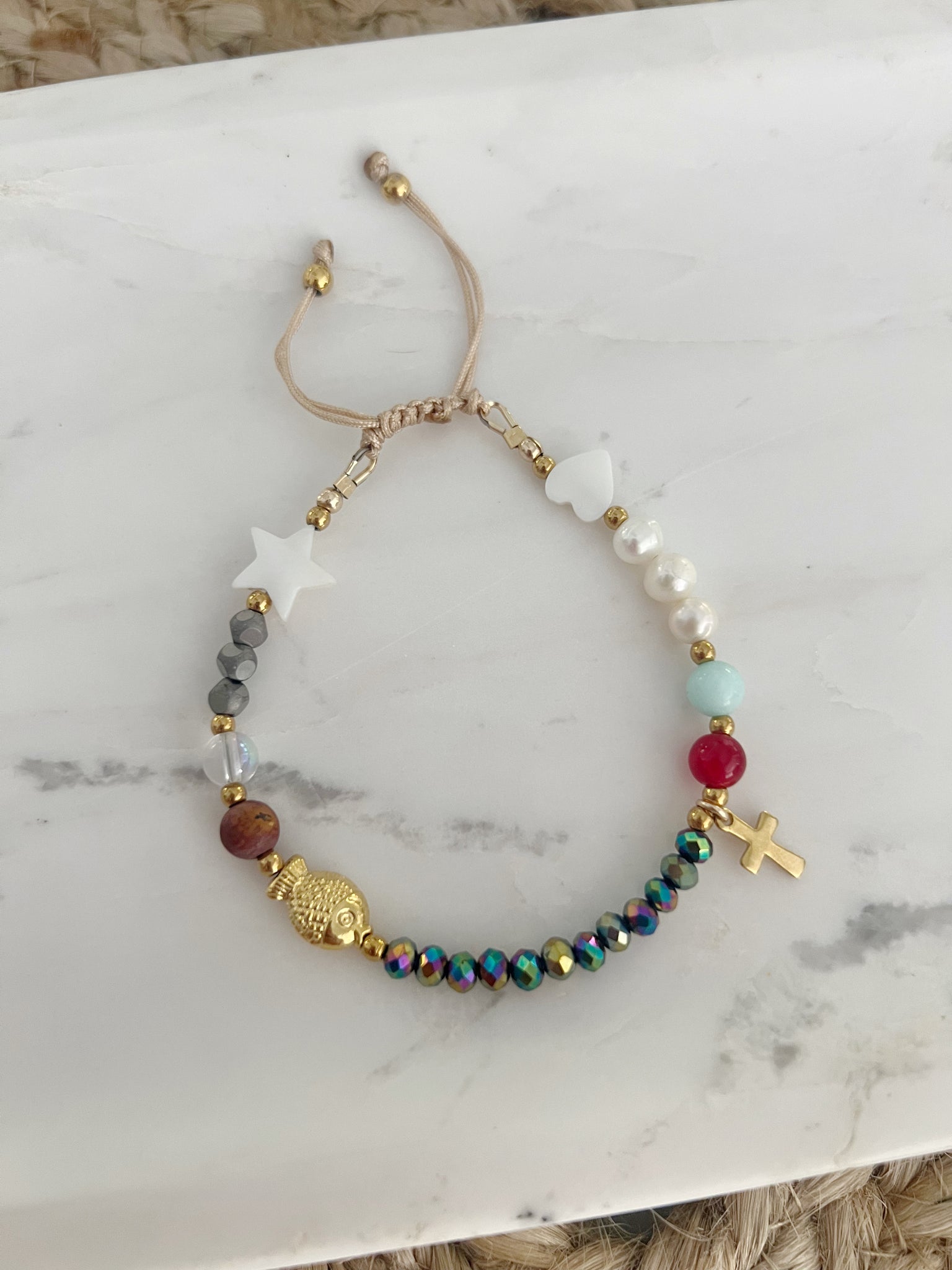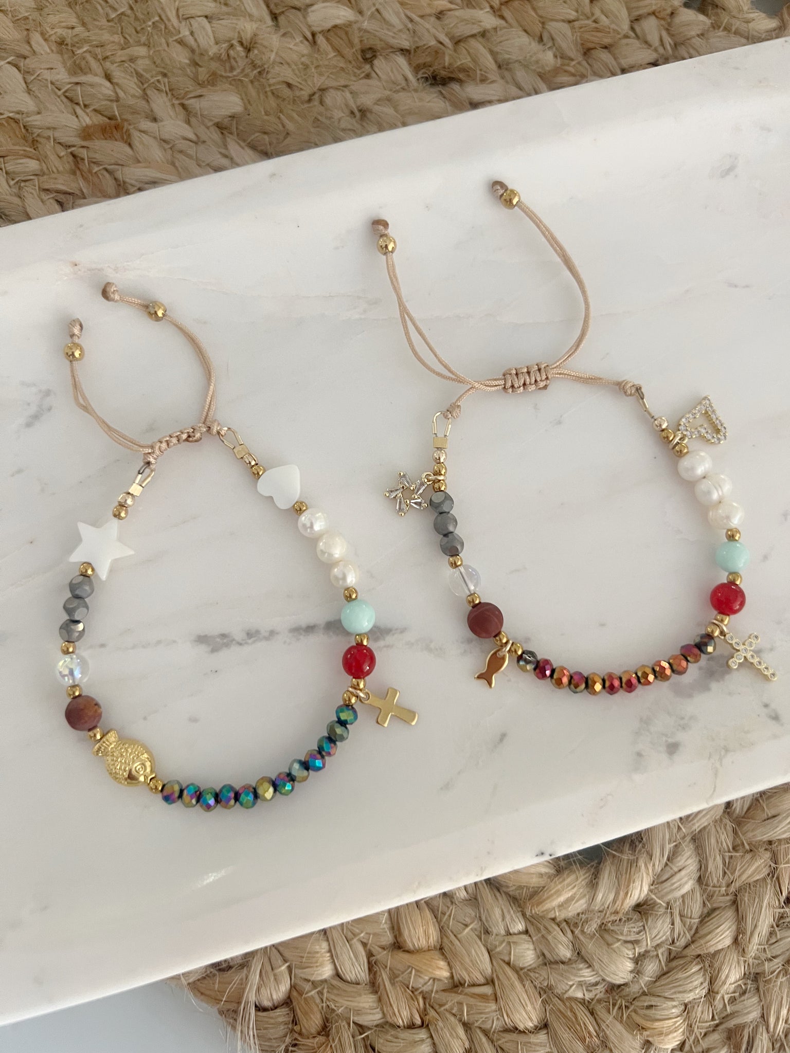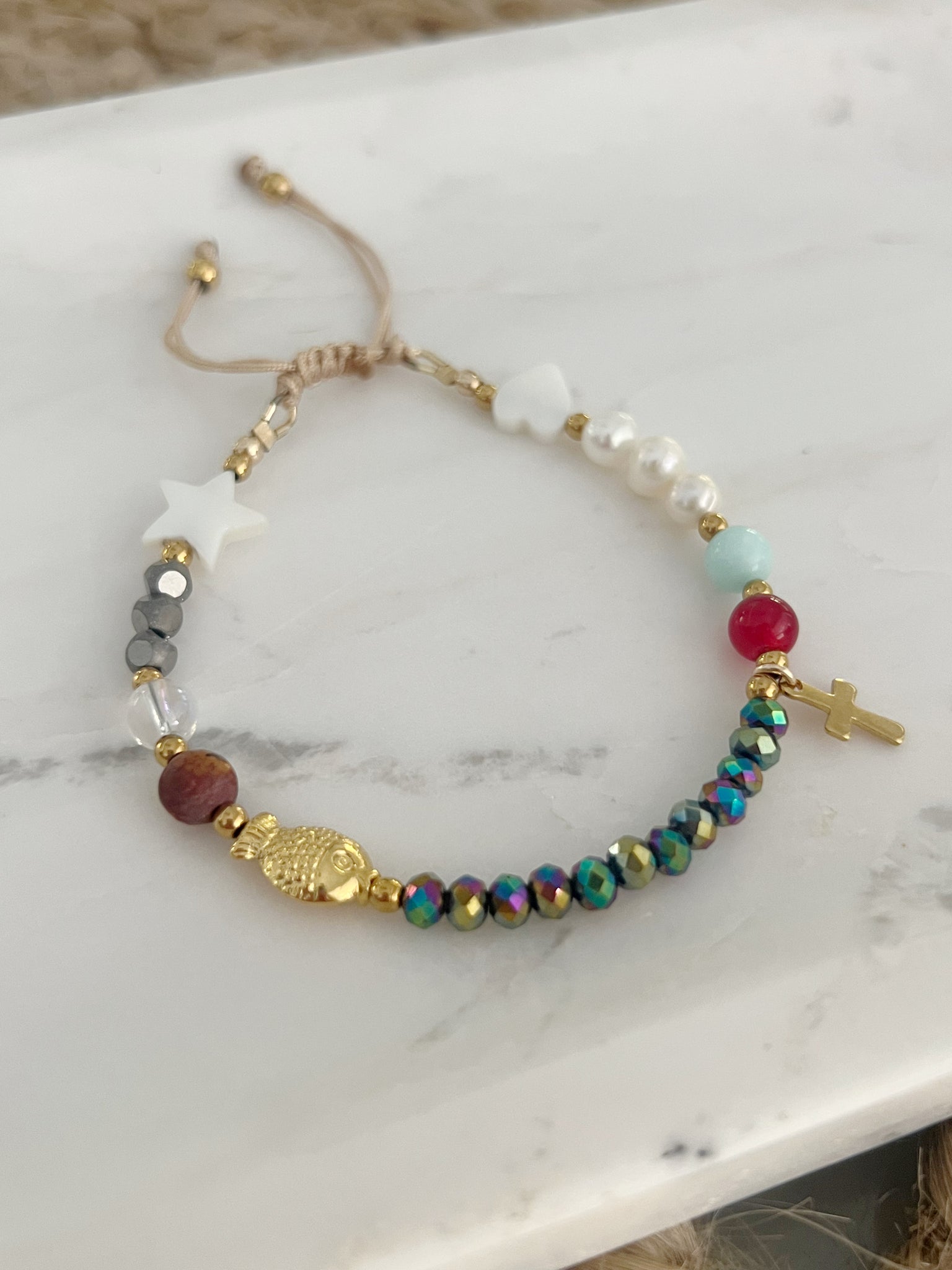 Pulseras ajustables, hechas a mano. Detalles y piezas doradas en gold filled, gold plated y stainless steel. Cada una de las pulseras incluye la tarjeta donde se cuenta la Historia de Jesús