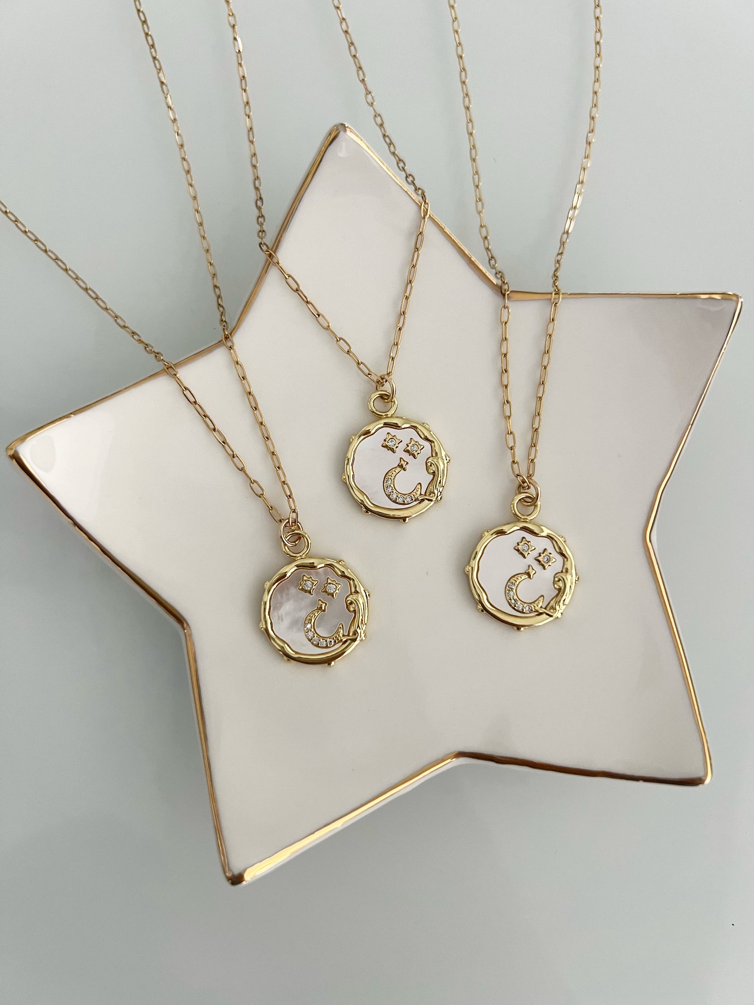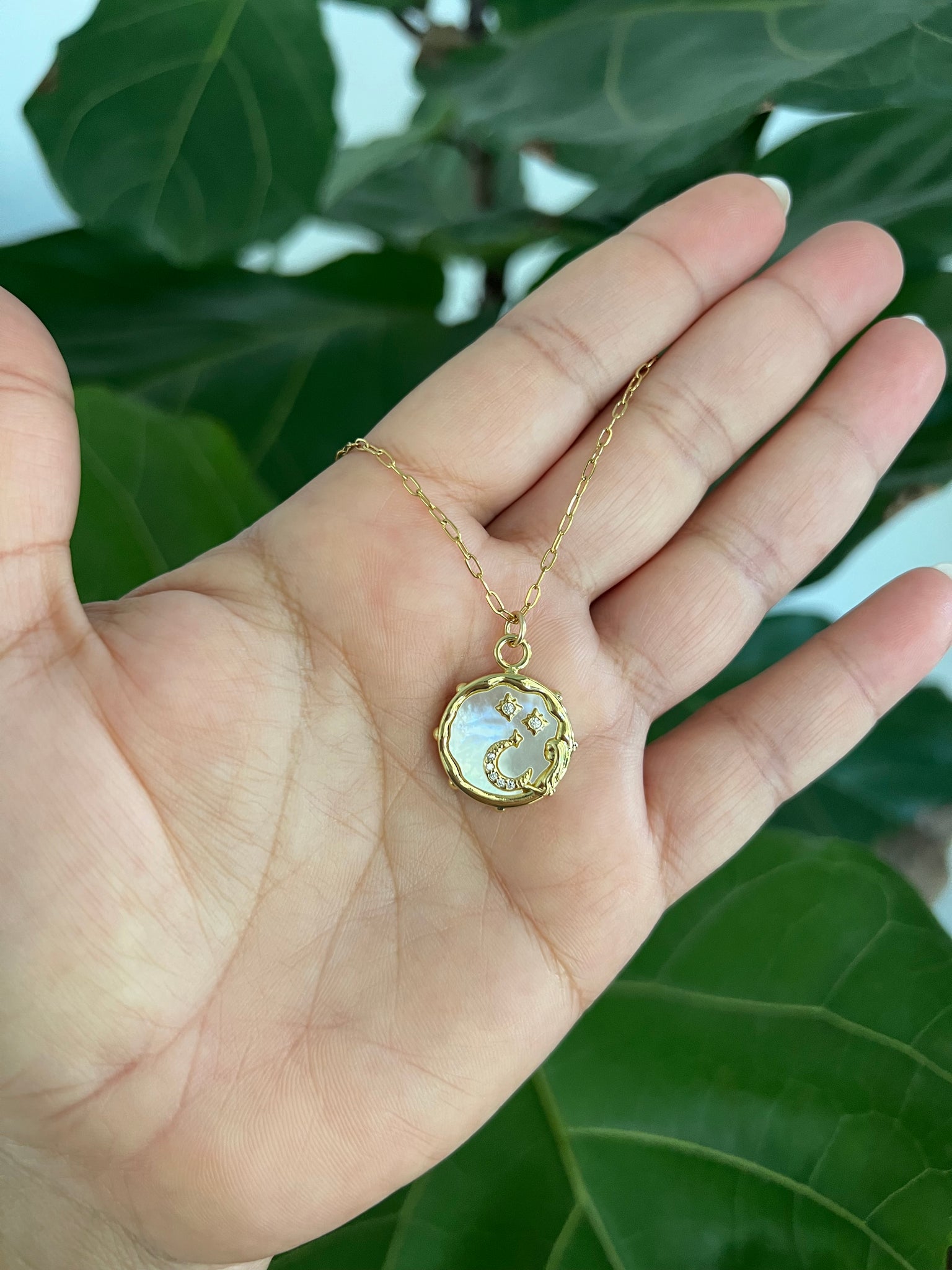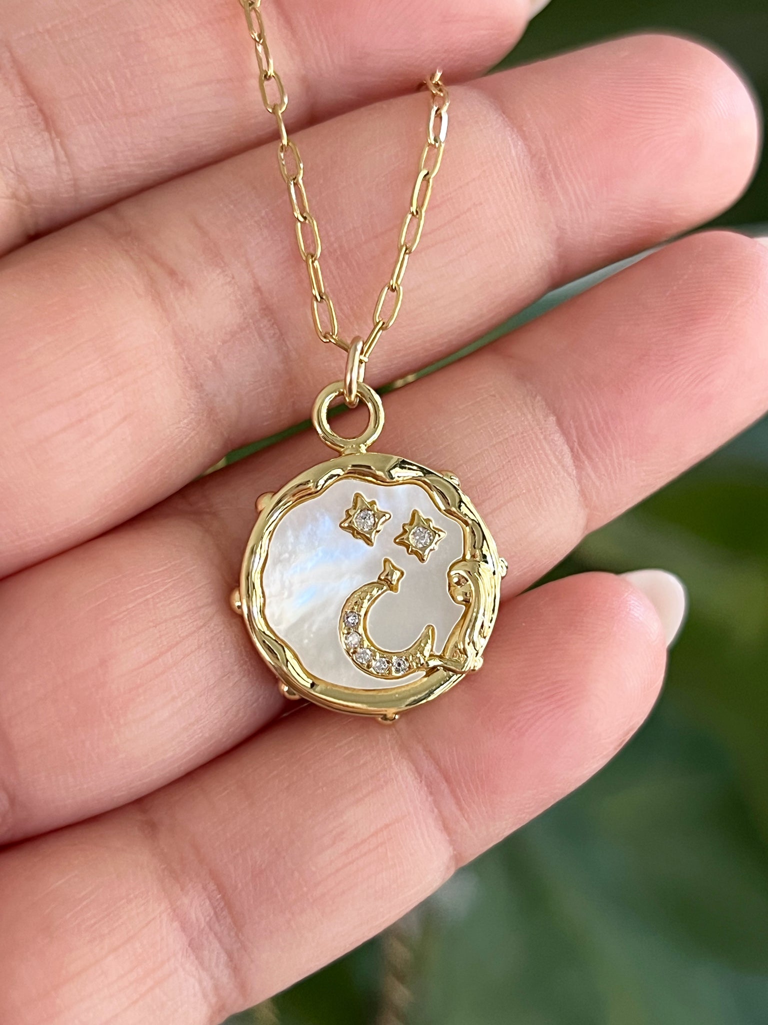 Cadena en acero inoxidable. Mide 17”. Charm con baño en oro, madre perla y zirconias.